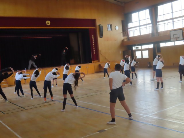 学年児童全体への紹介のあと、学級ごとに実演をしていただき、その後子どもたちもダンスの経験をしました。