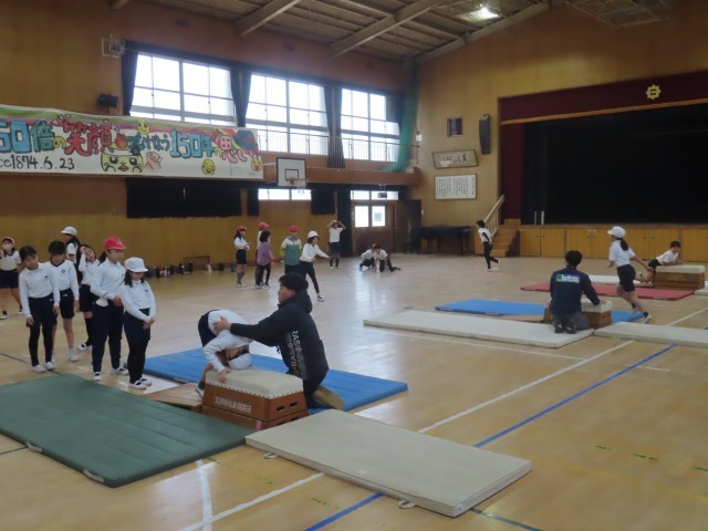 今日は4年生は西区の事業でインストラクターの方々が来校され、学級ごとに跳び箱の台上前転の練習を中心に指導をしてくださいました。