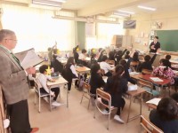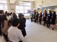 児童会の協力委員会のみなさんが正門に立って赤十字の募金活動をしてます。