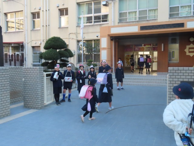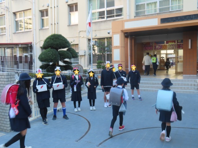 児童会の協力委員会のみなさんが正門に立って赤十字の募金活動をしてます。