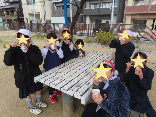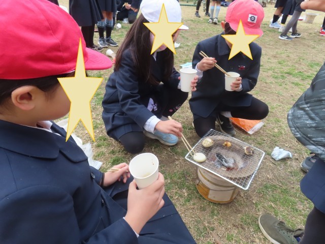 3年生が運動場の藤棚の前で七輪体験をしました。
