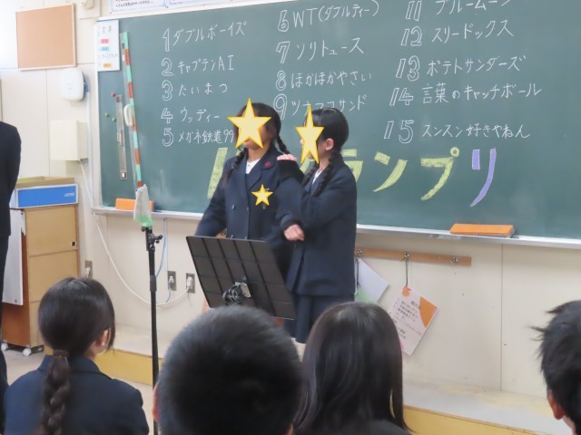 出囃子はMー1グランプリのリズムが鳴り響き舞台に5年生の芸人さんが出場します。