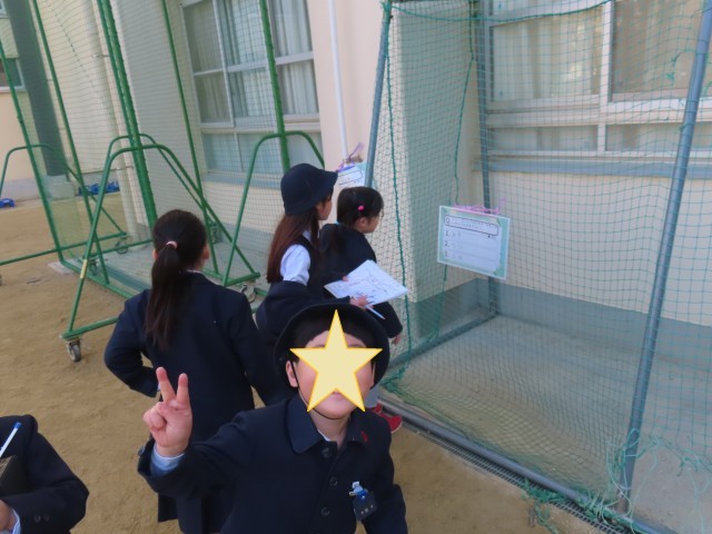 2枚目、3枚目は植物クイズラリーの様子です。グランドの樹木やネット、壁などにクイズが掲示されています。そのクイズの答えをシートに書き込み完成したら回収ボックスに入れます。