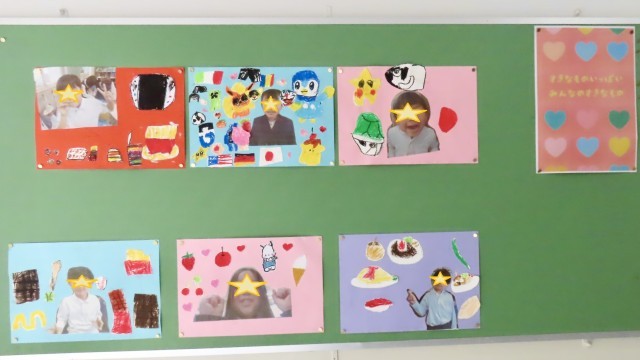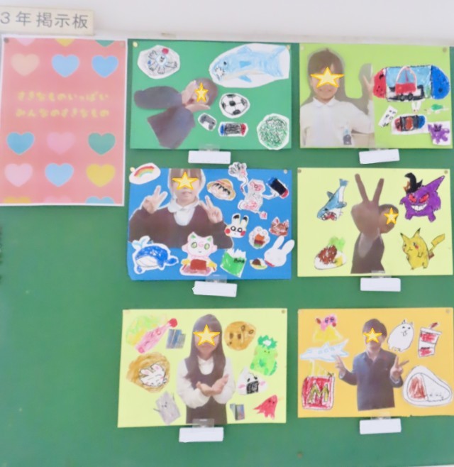 3年生の廊下を通るとかわいい作品が掲示しています。