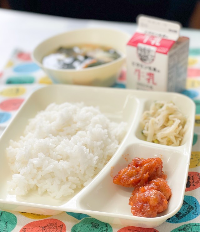 今日の献立は、ごはん、ヤンニョムチキン、とうふのスープ、切干しだいこんのナムル、牛乳です。
