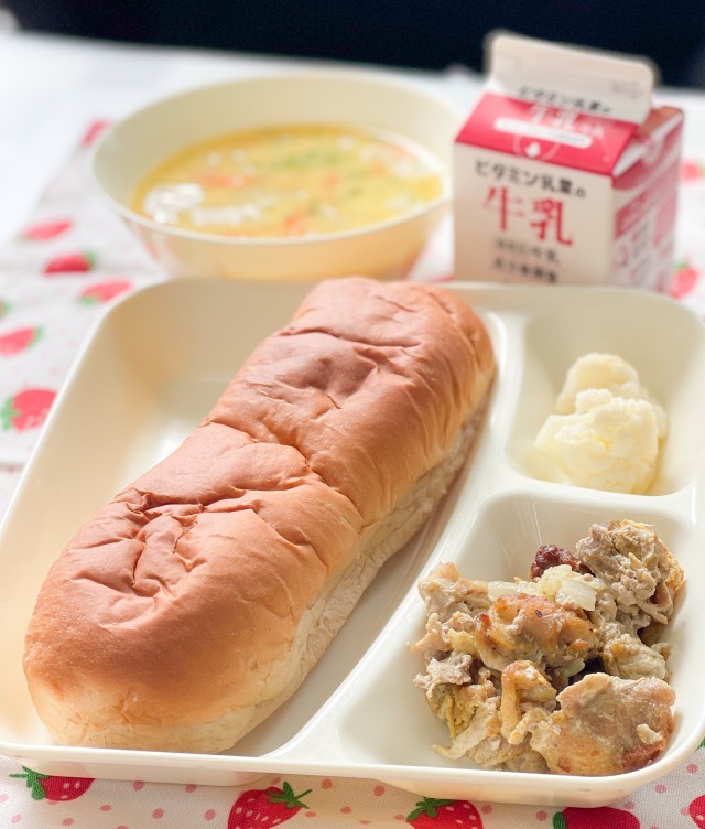 1/30の給食は、コッペパン、いちごジャム、鶏肉のからあげ、ハムと野菜の中華スープ、もやしのコーンの中華あえ、牛乳です。