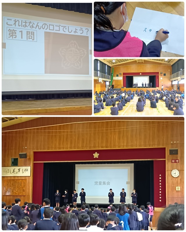 今日の児童集会は、「ロゴクイズ」でした。お店やブランドのロゴの写真が出てきて、それが何のロゴかをグループで考えるゲームです。中には九条南小学校のロゴも出てきて、大盛り上がりでした。