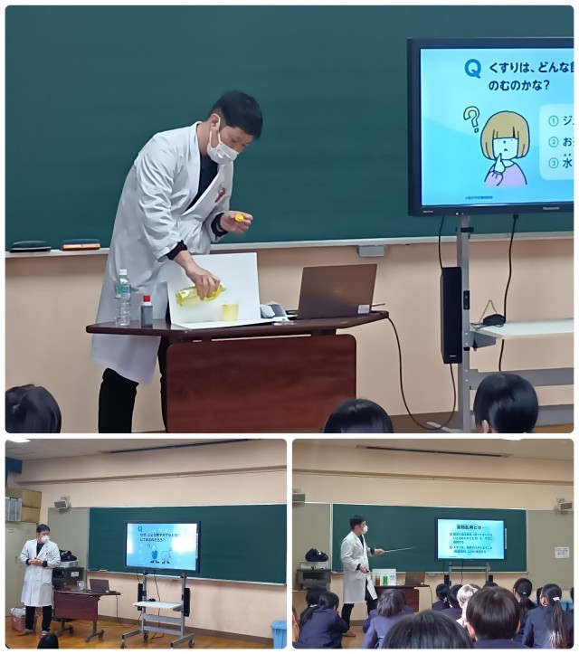 学校薬剤師森先生によるくすりの正しい使い方講座がありました。くすりの働き、服用方法などの説明を受けました。くすりをどんな飲み物で飲むかの実験では、水以外で飲むと効果がなくなったり、真っ黒になってしまったりといった様子をみて驚愕していました。