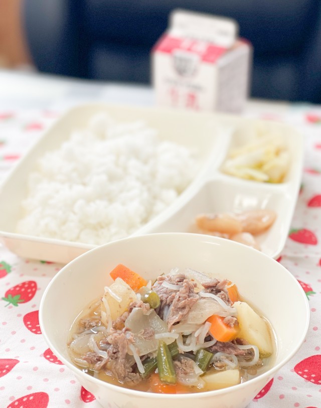 今日の献立は、ごはん、肉じゃが、はくさいのゆず風味、白花豆の煮もの、牛乳でした。