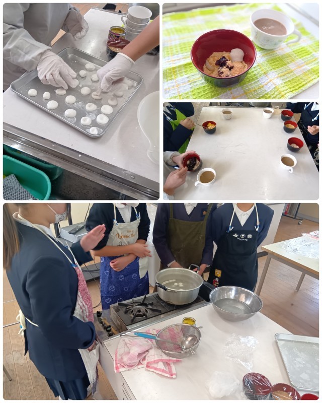 5年生は、昨日は1組、今日は2組で調理実習をしました。白玉団子作りをしました。白玉粉に水を入れ、こねて丸い形にし、白玉団子をたくさん作っていきました。トッピングに、フルーツやあんこ、きな粉を添え、みんなで美味しくいただきました。
