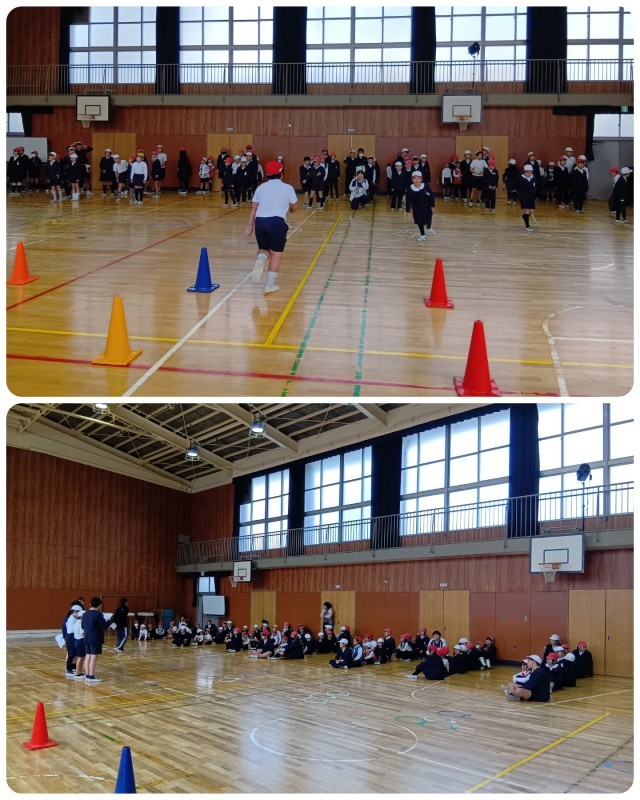 たてわり班の1班から4班で、たてわり遊びをしました。各班対抗で、リレーをしました。ケンケンパーや、コーンを使ったコースを走りました。たてわり班で仲良く交流することができました。