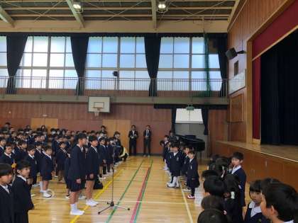 今年度新たに7名の教職員が加わり、子どもたちと初めて対面しました。新転任された7名の教職員からあいさつがありました。子どもたちは真剣な表情で聞いていました。最後に、6年生の代表2名が歓迎の言葉を伝えてくれました。
