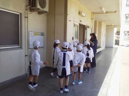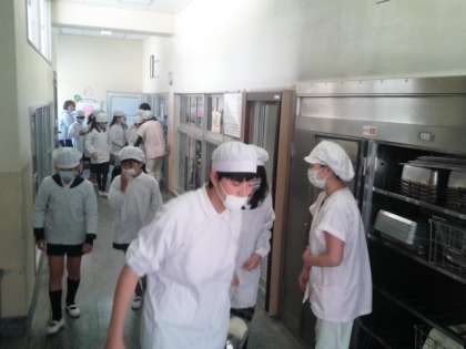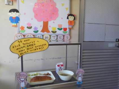 本校は給食室に入る前に、まず、給食室の前で当番の児童みんなで献立を読みあげます。その後、給食室に入り、感謝の気持ちを込めて「いただきます」とあいさつしてから、給食調理員からおかずや食器などを受け取ります。