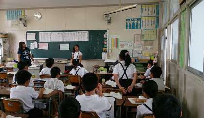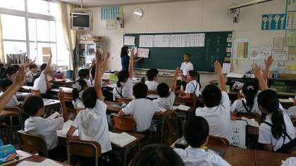 子どもたちは真剣に学習に取り組み、体育ではプールで精一杯泳ぎ、休み時間は楽しく運動場で遊んでいます。