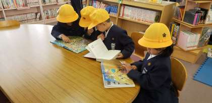 図書の時間に1年生みんなで図書室へ行きました。今週は、まだ図書の本は借りず、図書室での約束事を確認して、楽しく読書の時間を過ごしました。