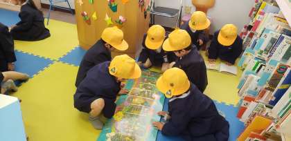 図書室では、自分が読みたい本を一人でじっくり読んでいる子、椅子に座って友だちと一緒に本を見ている子、大型絵本をマットの上に置いてみんなで見ている子・・・一人ひとり楽しく過ごしていました。