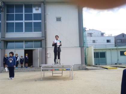 校長先生からは、地域の企業から寄贈された「自主学習用のノート」の紹介や九条南小学校が「英検の奨励賞」を受賞した報告の話がありました。