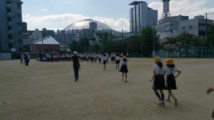 運動場にいるときに地震が起これば建物から離れた運動場中央に避難する。