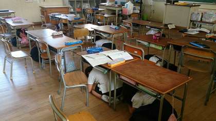 廊下にいるときに地震が起これば、近くの教室の机の下に避難する。