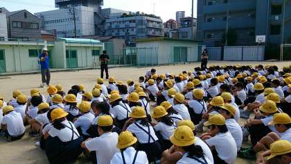 今回の避難訓練は、地震が休み時間に起こり停電で放送機器が使えなくなった想定で行いました。