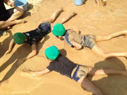 水を運ぶ役割と掘る役割に分かれて大きな川をつくったり、みんなでしゃがんで輪になり「しろいすなをつかうときれいなだんごになるよ。」とアドバイスしあったり、泥の中に寝ころび、太陽であったまった土の温かさを感じたりと、体全体を使って友だちと土や砂に触れることを楽しみました。