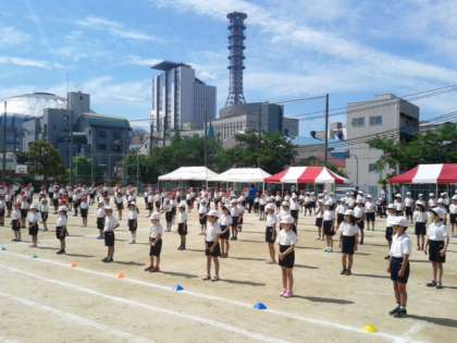 昨日の天候不良のため延期になった運動会全体練習を最高の青空のもと行いました。