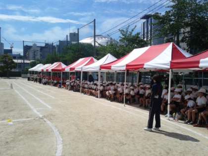 先日、PTAの方々に近隣の小学校からお借りした児童席用のテントを運んでいただきました。今日は少し暑い陽気でしたが、そのテントのおかげで練習もスムーズに行うことができました。ありがとうございました。