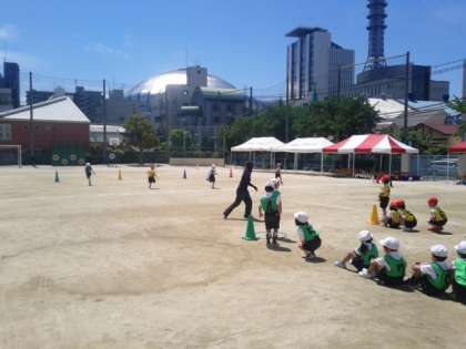 運動会まであと少し。練習にもより熱が入ってきました。今日は、団体演技を実際に使うキラキラバトンを手にもって踊りました。太陽の光に反射するバトンは、子どもたちのダンスをより輝かせていました。