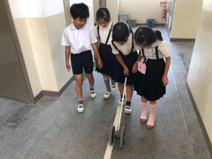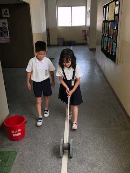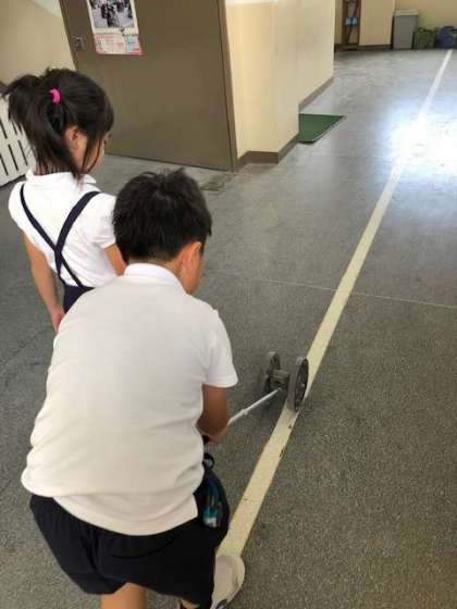 そこで、1kmとはどれぐらいの長さなのかを実感するために「教室の前の廊下を何回往復すると1kmになるのか」と課題を決め、みんなで協力して調べることにしました。