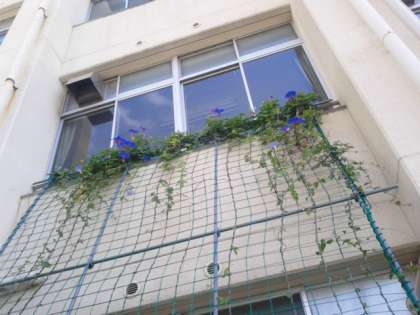 北校舎の壁際に昨年度植えた「琉球あさがお」の花がきれいに咲いています。その横には、「ゴーヤ」も植えており、これも順調に生長しています。
