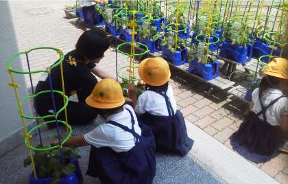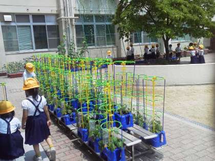 雨の日が続き、じっくり観察ができなかった間に、何やらにょろにょろと長い「つる」が伸びてきました。長いものは、お隣の友だちの植木鉢の方へまで・・・。これではいけないと、子どもたちと話し合いをし、「支柱」を立てることにしました。