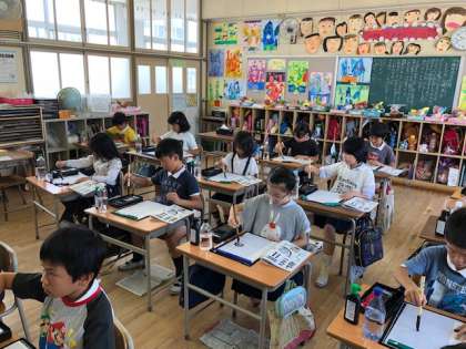 3年生は、書写の時間に初めて毛筆を使って学習しました。
