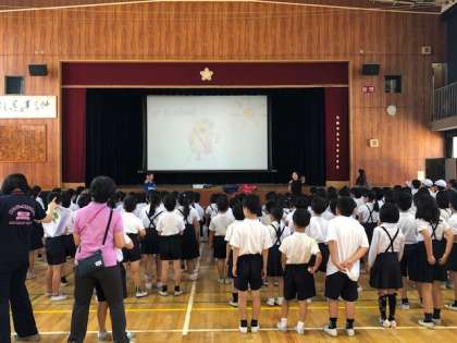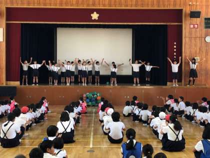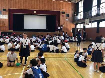 児童集会は「ばくだんゲーム」をしました。グループでボールを回し、曲が止まって時に持っていた人が、自己紹介をします。たてわり班の絆が深めるように集会委員会の皆さんが考えてくれたゲームです。どの班も輪になって楽しそうに自己紹介をしていました。