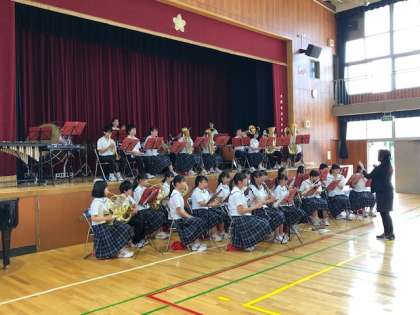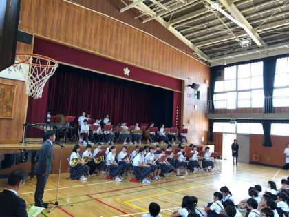 小学校では見たことのない楽器の数々、初めて聴く楽器の音色、音色が重なり合った迫力ある演奏に、子どもたちは目を輝かせていました。会場から自然と手拍子が生まれるほど、楽しくあたたかい雰囲気で公演会が進んでいきました。なじみのある曲では、自然に歌を口ずさむ子どもたちと吹奏楽部の演奏ですてきなハーモニーが生まれました。