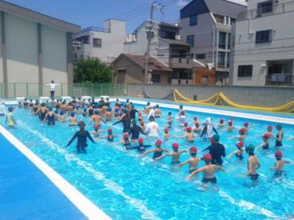 1年生は、大きなプールにワクワクドキドキ。少し不安そうな1年生もいましたが、6年生が一人一人の手をつないで、優しくリードしてくれたので安心してプールの楽しさを味わうことができたようです。