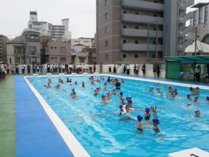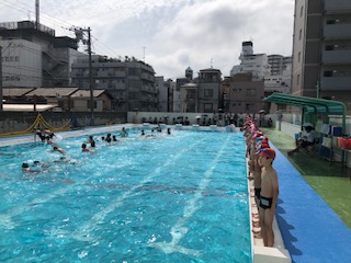 気温・水温とも時間とともに上がってきて、子どもたちは気持ちよさそうに水泳学習を楽しんでいました。