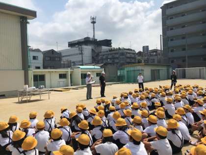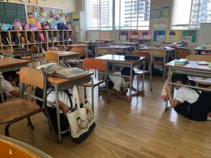 子どもたちは地震発生と同時に机の下にもぐり、机の脚をしっかり持ち、自分の体を守りました。そのあと、運動場へ一時避難し、みんなの無事を確認しました。そして津波警報が出たということで、先生たちが校舎の安全を確認したのち、みんなで4階へ避難しました。
