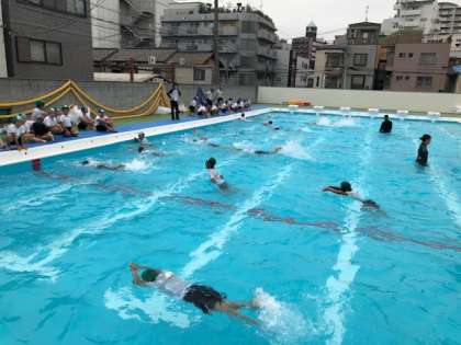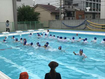 本日、着衣泳を1・2年生、3・4年生、5・6年生に分かれて行いました。