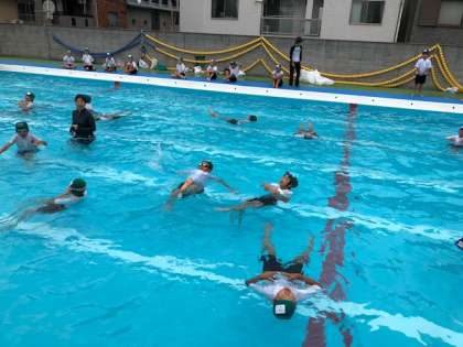 また、『浮いて待つ』を合言葉に、もし服を着たまま海や川に入ってしまったら、浮いて待つのが大切だということを学びました。服に空気を入れたり、ペットボトルを使ったりして浮く練習をしました。