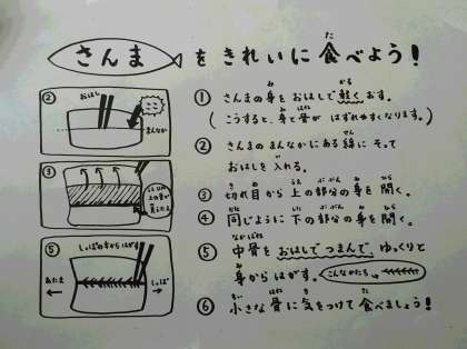 そして、本日の給食には「秋刀魚」が出るということで、さんまのきれいな食べ方も教えていただきました。給食では、「きれいに骨が取れました!」と嬉しそうに報告をする子どもたちの姿がありました。これからの生活にも役立つ技を身につけることができたようです。