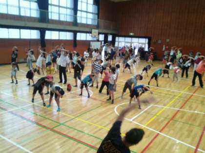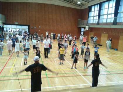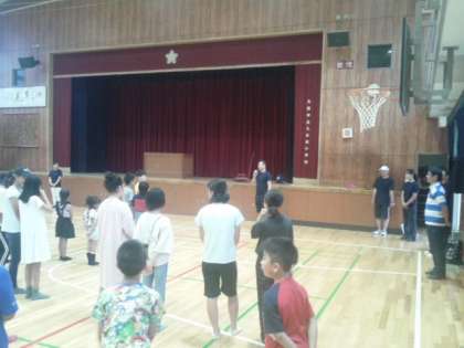 今日は、あいにくの天候で体育館でのラジオ体操初日となりましたが、たくさんの地域や保護者の方々、子どもたちが参加していました。