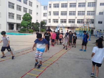 朝早くから運動場に集まった子どもたちは、ラダーを使ったトレーニングやスタートとの姿勢、本番を想定した100m近い距離を走り切る練習を行いました。