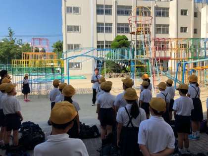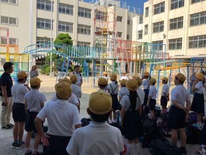 朝から日差しがきつかったので、日陰の場所を選んで出発式を行いました。