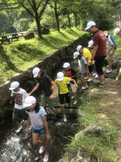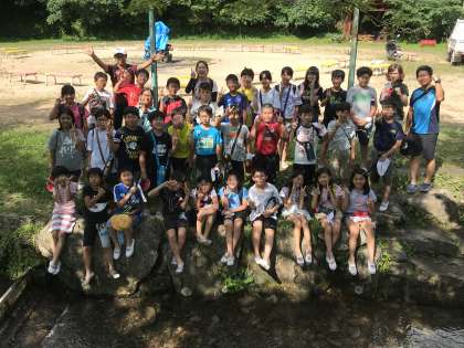 さあ、魚つかみです。でも、その前に全員で集合写真をとりました。みんな充実した表情をしていますね。