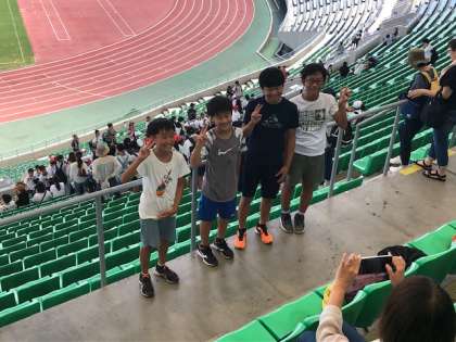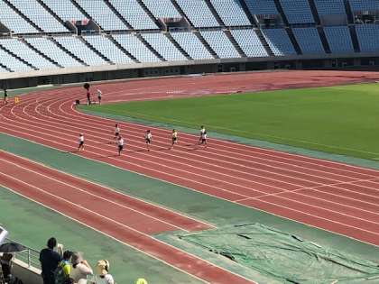 直線距離での100mを学校で走ることはできませんが、国の代表選手が実際に競技で使うトラックを最後まで全力で走りぬきました。この暑さのなか、本当に見事な走りで、観客に感動を与えてくれました。