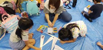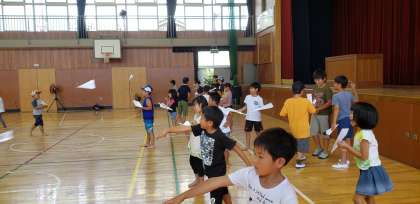 前半は、多目的室で紙飛行機を作りました。大きさや形、デザインなどを工夫して、子どもたちなりの紙飛行機を作っていました。その後、体育館で実際にその紙飛行機を飛ばして、どれだけ飛ぶのかを試していました。