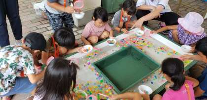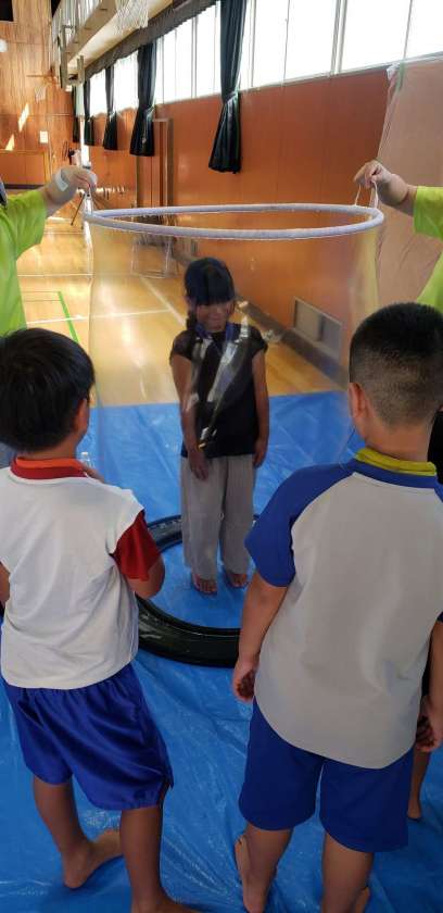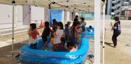後半は、運動場で水遊びを行いました。簡易プールでの水遊び(テントの上から水が落ちてくる仕掛けもありました)をはじめ、水鉄砲を使った的当て、スーパーボールすくい、ジャンボシャボン玉体験、水風船玉入れと趣向を凝らした遊びがたくさんあって、子どもたちも大喜びでした。