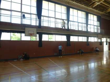 10日の早朝より、学校体育施設開放の各団体の皆さん(子どもたちも含めて約40名が参加)で体育館の掃除とワックスがけを行っていただきました。暑い中での作業でしたが、体育館の隅々まで丁寧にきれいに掃除してくださいました。