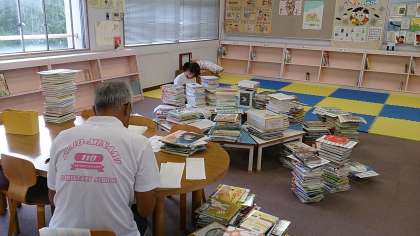 9/6(月)台風による臨時休校を利用し、課業中には時間が中々確保できず、作業が進まなかったバーコードの入力とバーコードの貼り付け作業を教員全員で1日かけて行いました。