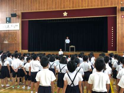 今日の朝会では、夏季休業中にさまざまな方面で頑張った児童の表彰式が行われました。